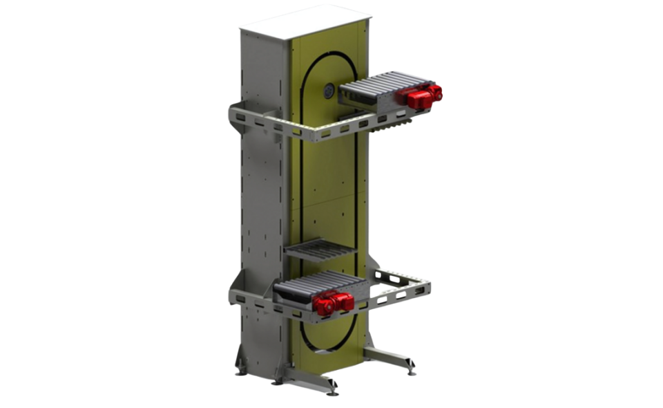 Sistema automatico per il trasporto verticale di colli tra diversi livelli: funziona con piattaforme che si muovono in ciclo continuo su una guida ad anello, caricando e scaricando i prodotti tramite nastri a rulli. È ideale per linee produttive grazie al flusso costante e al minimo ingombro.